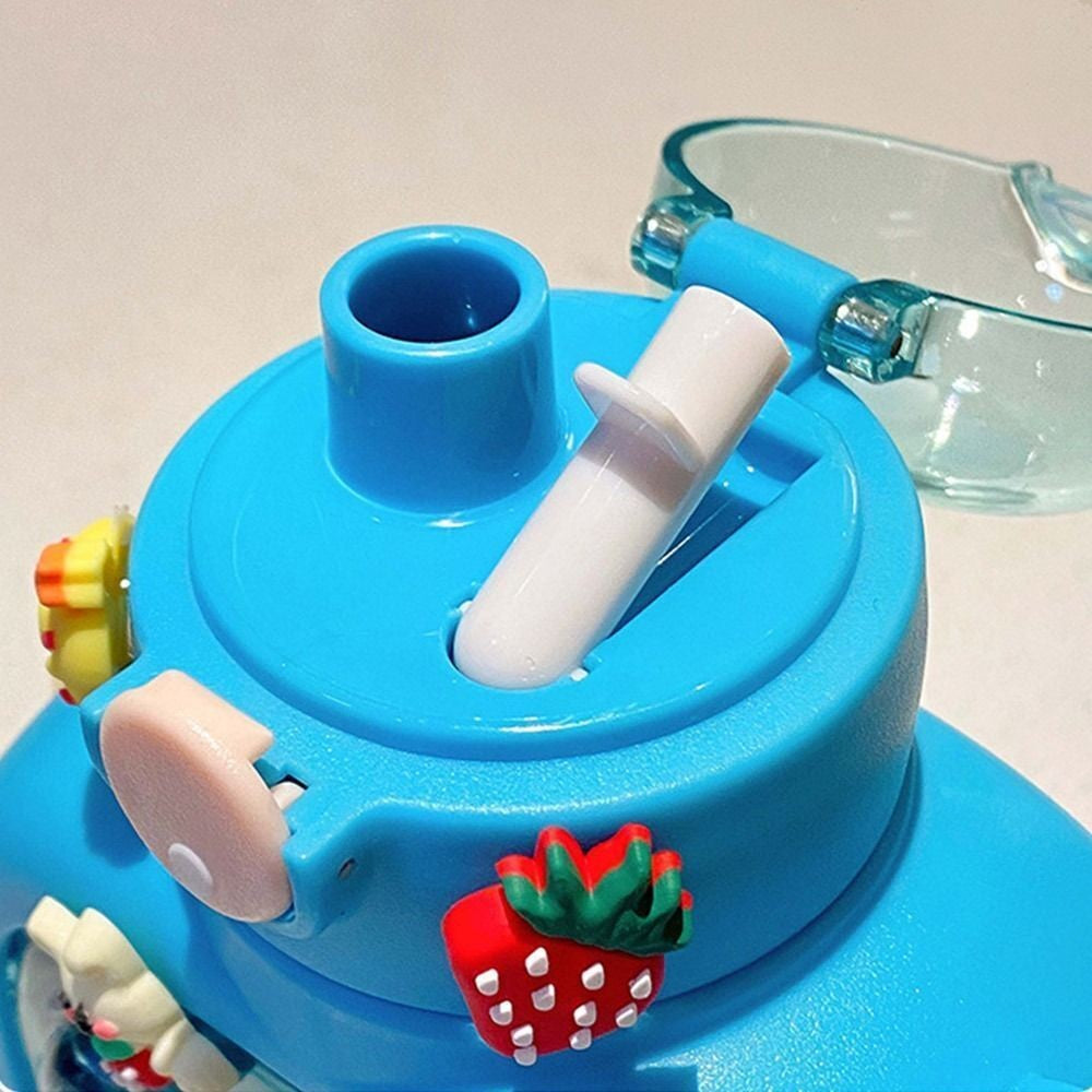 Sticla cu pai pentru copii, model ursulet, gradata, stickere aplicate, curea reglabila, din plastic rezistent la cadere, 1l, Albastru, 20 x 13 cm