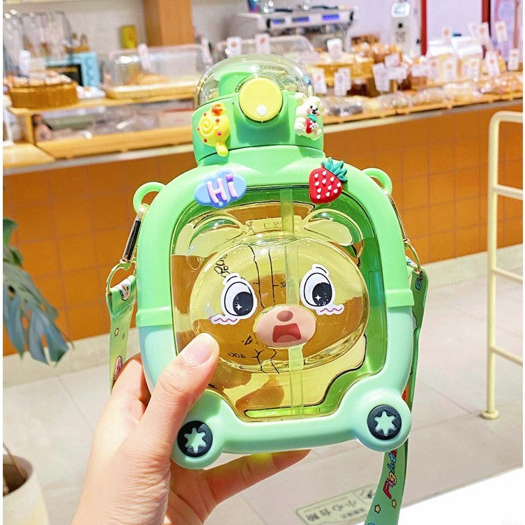 Sticla cu pai pentru copii, model ursulet, gradata, stickere aplicate, curea reglabila, din plastic rezistent la cadere, 1l, Verde, 20 x 13 cm